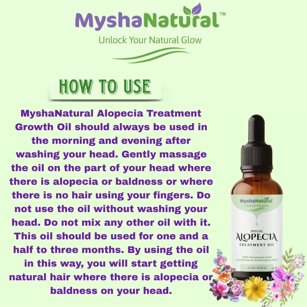 MyshaNatural™ Alopecia Treatment Oil is a powerful and therapeutic blend of 100% pure essential oils and herbal extracts, carefully crafted to combat hair loss, thinning, and alopecia naturally.